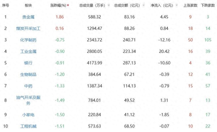 板块方面,贵金属、煤炭开采加工上涨,通信服务、旅游及酒店、零售跌幅居前。
